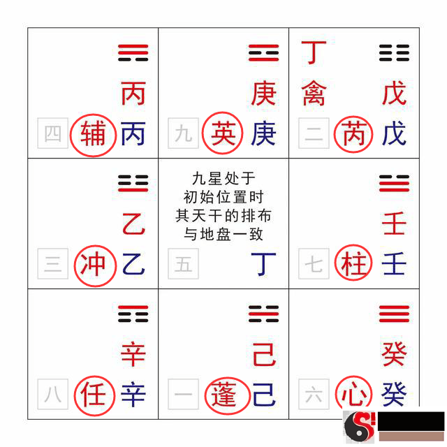 以前提及过,九星的运行规律性是看时辰所确认的,实际的说所落宫位看时干而定。此盘可以见到,天辅星在艮八宫,而此时辰的十二天干为戊,恰好地盘的戊在艮八宫。