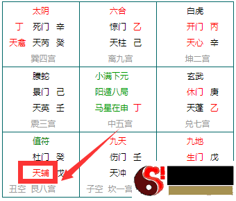 可以见到地盘的(甲寅)癸在巽4宫,巽四宫原始星为天辅星,值符就为天辅星,我们可以在详细的盘里见到天辅星落在了艮八宫上