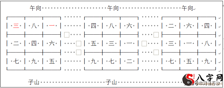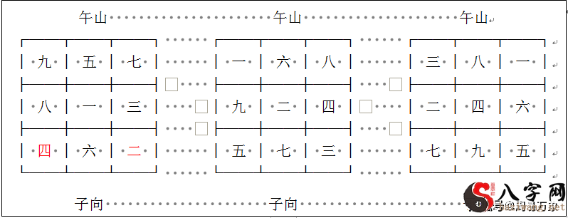 第三种状况,向方两侧一式两份大门排不上财气,两侧大门没法取用,大门诀不能用。例如一运午山子向,子属中天龙,大门在乾与艮。一运午山子向,挨星二到乾、四到艮(下面的图下左图)。二之后天八卦坤宫中天龙坤为阳,故二顺飞乾为三,旺星不可以到乾(下图中图)。四之后天八卦巽宫中天龙巽为阳,故四顺飞为七,旺星也不上艮(下面的图下图)。因此也没有大门可用。