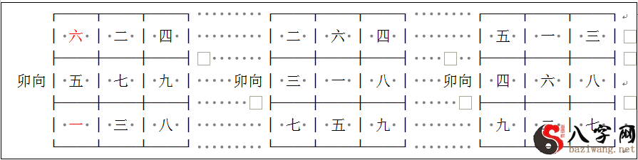 再例如七运酉山卯向,卯属中天龙,大门在艮与巽。挨星一排到艮,六到巽(如下图下左图)。一之后天八卦坎的中天龙子为阴,故一入中逆飞,旺星七到艮,艮为卯向的正大门(下图中图)。六之后天八卦乾的中天龙乾为阳,故六顺飞使五排到巽为衰死之气(下面的图下图)。因此仅有正大门可用。